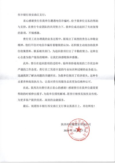 近日,恒丰银行西安曲江支行收到了一封来自客户的感谢信。信中提及支行工作人员凭借敏锐的洞察力、专业过硬的职业素养以及灵活的应急处理能力,积极与警方协同,挽回客户资金损失400余万元。