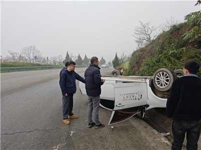 王震、宫琪两名同志几乎在同一时间奔向后备箱寻找救援工具,但车辆倾覆,救援难度大,二人费劲九牛二虎之力,耗时15分钟,终于将被困司机成功救出。120急救人员赶到现场后,确认被困司机无生命危险并送往医院检查。